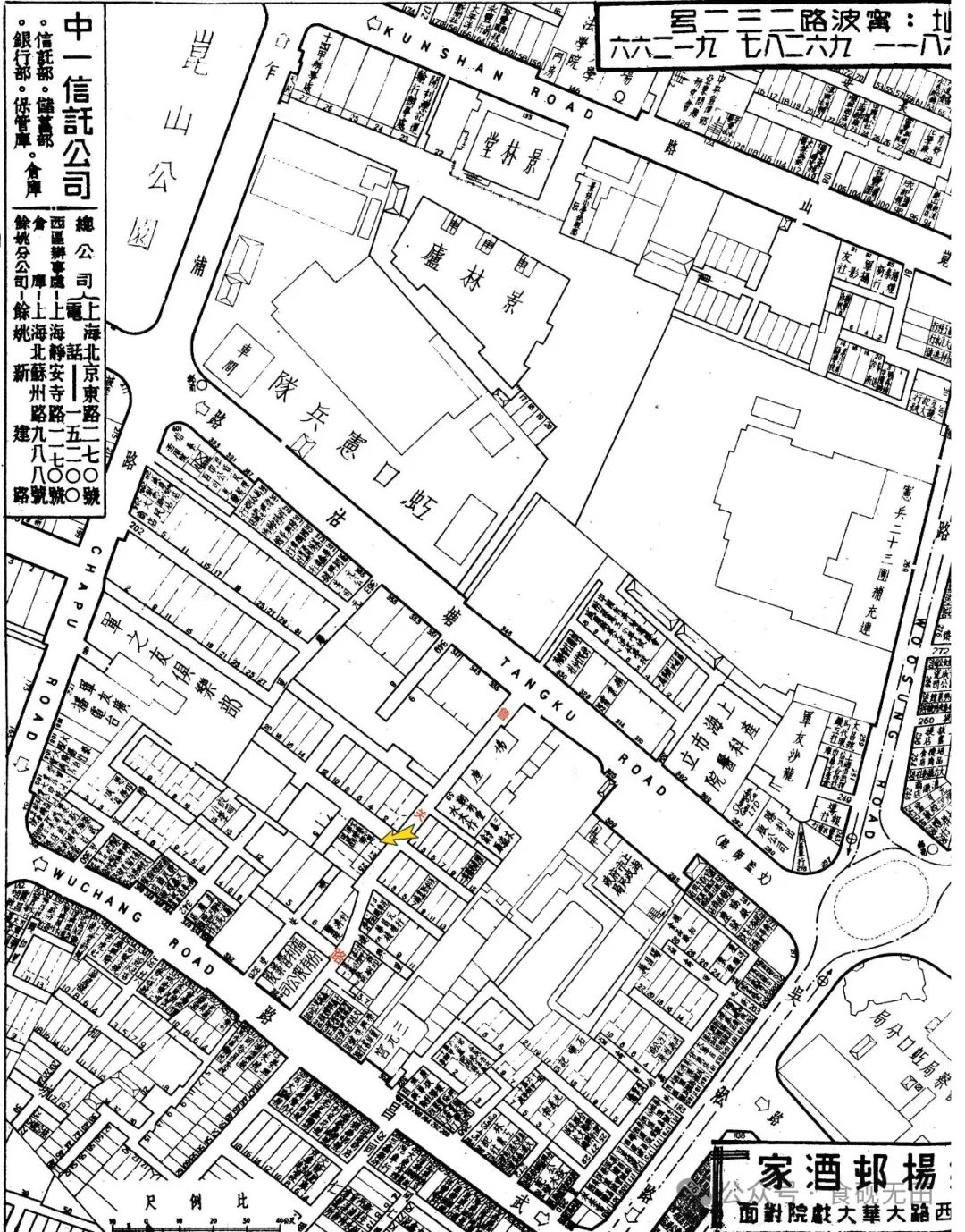 鲁关路是虹口境内一条弄堂小马路,北迄塘沽路,南达武昌路,位于吴淞路至乍浦路间。该路狭窄,路内有双号10、20、30、40四条小弄堂,单号有31弄。经查,一般上海市交通地图上皆无此路标识,而1989年版《上海商用地图》、1998年版《虹口区地图》,以及木之内诚编著的2011年版《上海历史地图》中均有“鲁关路”标识(P29)。笔者有幸在万国地图社1942年4月印行的《最新上海里弄地图》中找到“三元里”弄堂名(美界文监师路坐北朝南,吴淞路西)之标识(图3),又在日本人绘制的1943年版《上海主要部详图》中发现了“鲁关路”之标识(图4)。可是,1943年10月10日汪伪政府颁布的《上海特别市更改路名对照表》中“鲁关路”却没有列入,以致战后1947年发行的《上海市行号路图录》(上册图31)亦遗漏了“鲁关路”标识,图中可见在武昌路322号(《行路图》出版机构福利营业公司地址)东侧有一条南北向通道即原三元里,内有数条东西向小弄堂(图5,红字所示)。又查《虹口区河流图》悉,鲁关路原先为穿洪浜一支流,1920年代填浜筑路,初名三元里①,原来是条弄堂名②,约1943年③才改名为鲁关路。根据《申报》记载,1946年上海作家协会在鲁关路27号开设“文艺小憩”俱乐部④,先前这里开设一家日本料理店(图5,黄箭头所示)。原来这条绕遍寻不着的弄堂小路,也有不少活色生香的故事。