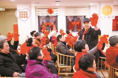 昨天,在黄浦区豫园街道“豫福里”热热闹闹举办了一场“欢天喜地闹元宵、银龄自健步步高”活动。图为老人们跟随音乐节拍,在老师的带领下集体展示“手袋木偶”。 本报记者 海沙尔 摄