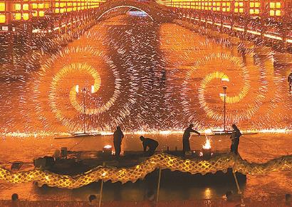 “火树银花”闹元宵。图为河北唐山民间艺人在表演打铁花。 新华社 发