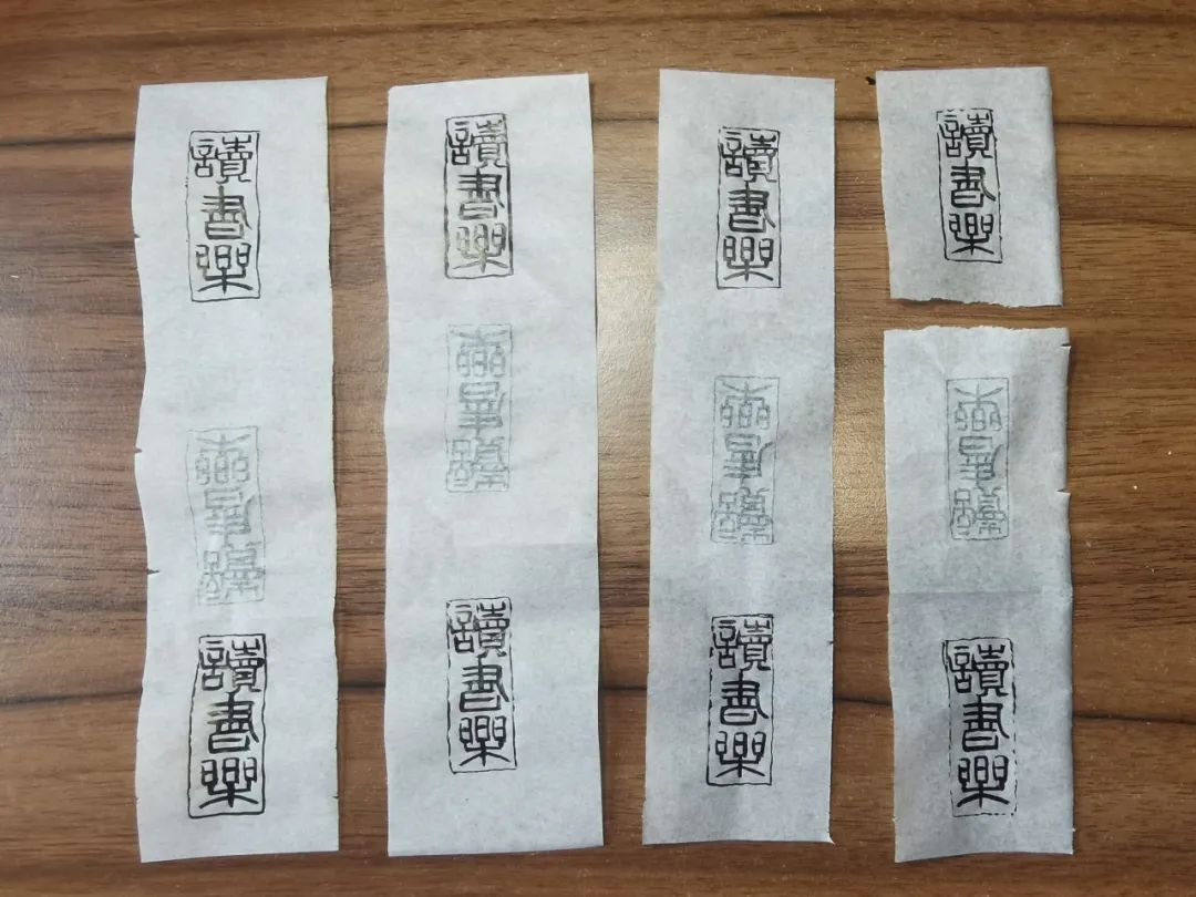 第一次刻,印稿写了十几遍,写来写去,总有不对的地方。刻出来后,拿给毛老师看,老师一眼就看出了问题:三个字大小不一,“读”字大而“书乐”二字小,只能磨了重刻。