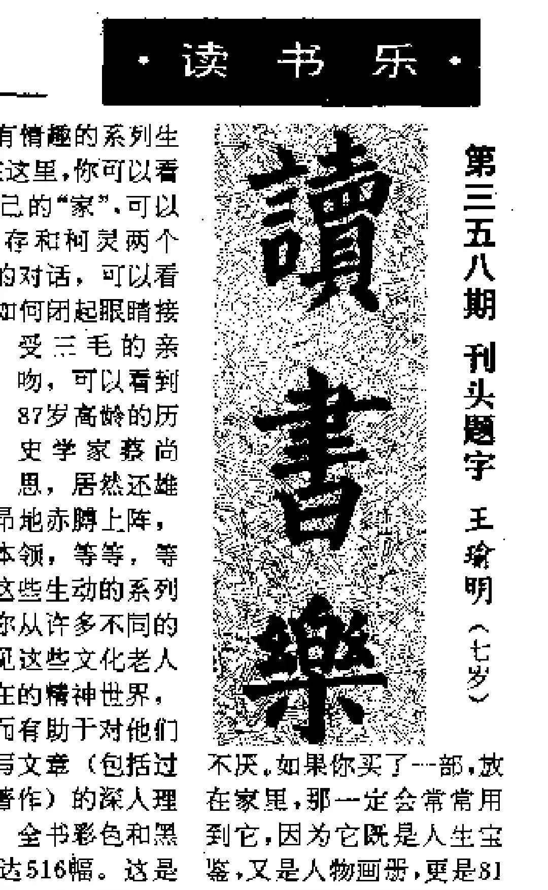 六岁,我开始练习书法。七岁那年,我写了一幅书法作品“读书乐”,爷爷觉得我写得不错,就把这幅字拿给他的一个朋友看。那位朋友看后,也觉得对一个七岁孩子来说,写成这样很不错,就把这幅作品推荐给了他的朋友——《新民晚报》“读书乐”版面的编辑米舒先生。