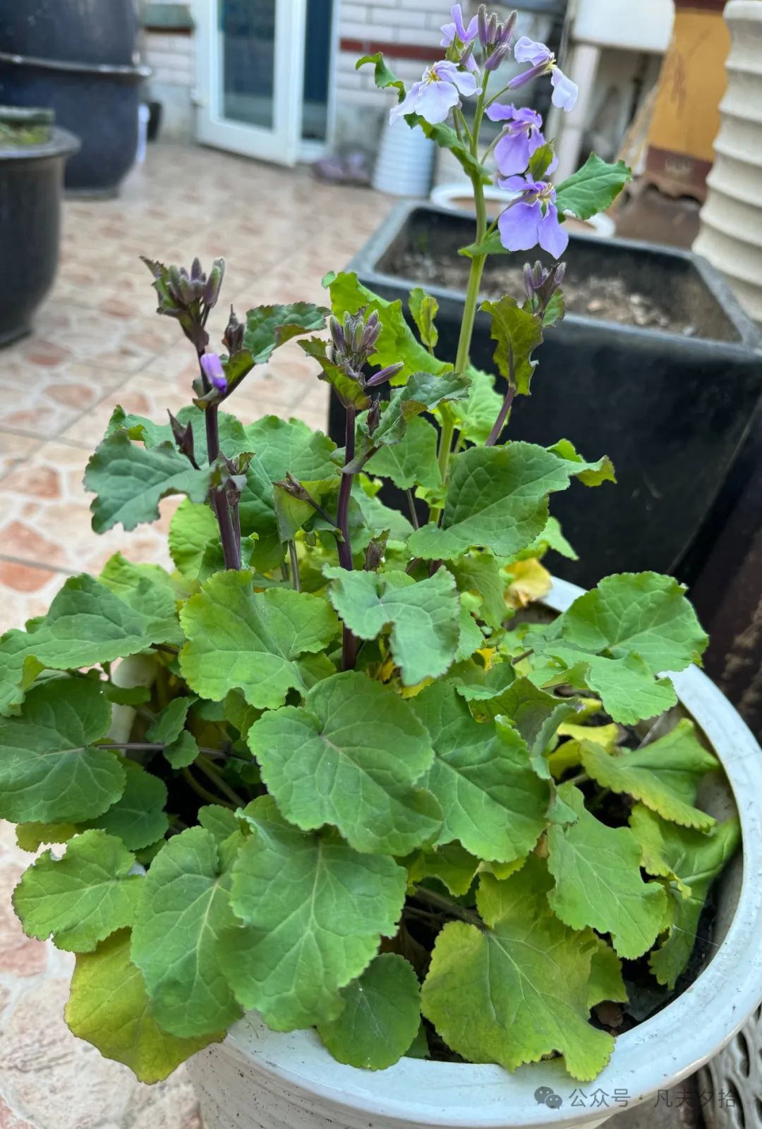今年冬天很冷,再加上连续下着冷雨,我家北面萧条的露台上,两棵紫藤只剩光秃秃的枝条攀在支架上,一棵凌霄花,也是仅剩几根细细的枝条,孤零零地挂在绳网上,它们都纷纷进入了冬眠期。唯有这两盆二月兰独自呈现着仅有的绿色。