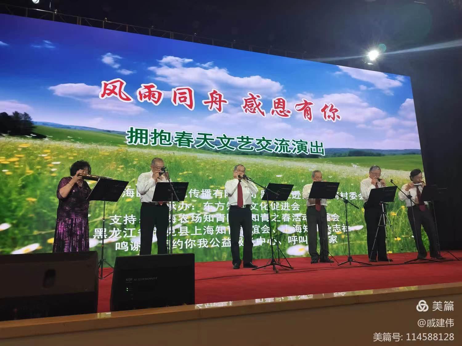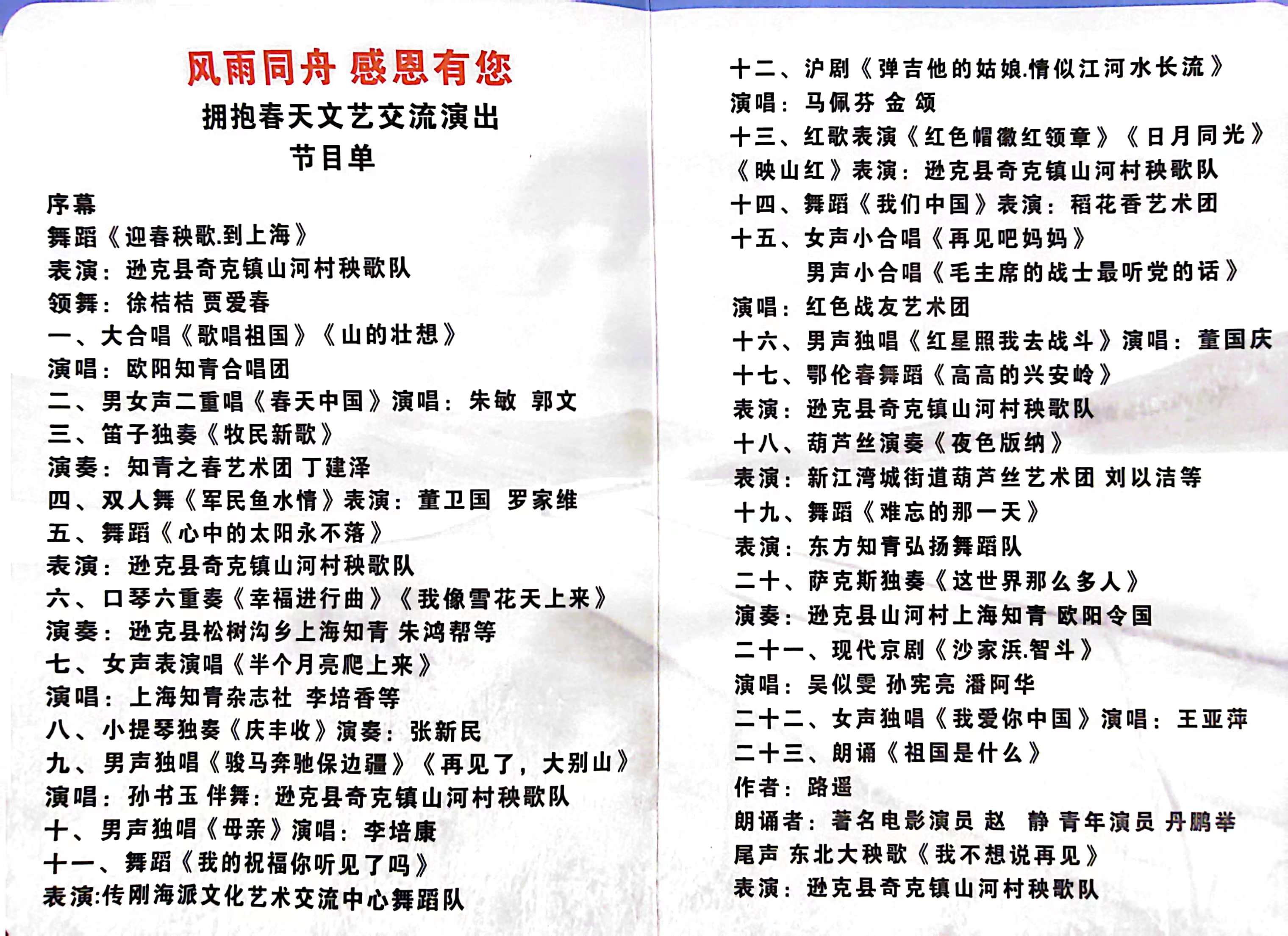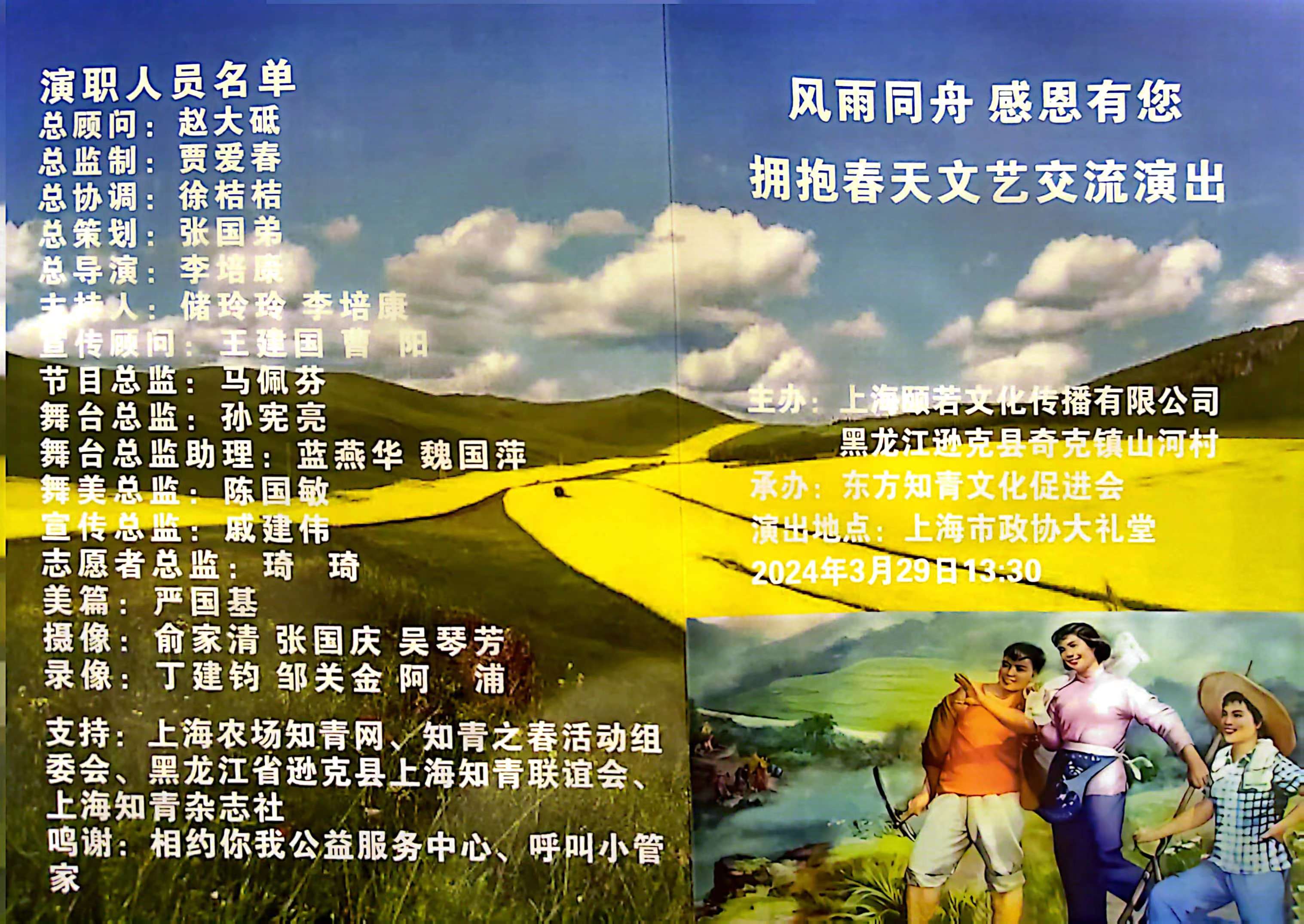 风雨同舟,感谢有您,天下知青是一家。作为本场演出的承办方东方知青文化促进会,则在很短的时间内,汇聚了沪上众多知青艺术团队,编排了独唱、男女声小合唱、大合唱、舞蹈、沪剧、京剧、器乐演奏等不同艺术表演形式、精彩纷呈的节目,与作为主办方之一的黑龙江奇克镇山河村秧歌队同台献艺,相拥这美丽的春天,共享这难忘的时光。