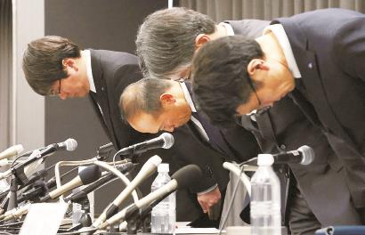 3月29日,在日本大阪,小林制药公司社长小林章浩(左二)在新闻发布会上鞠躬致歉。 新华社/法新发