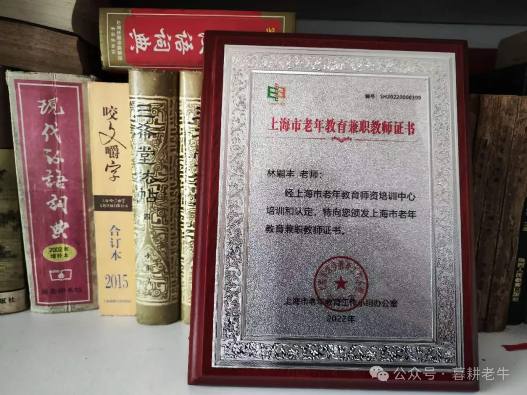 华泾镇社区(老年)学校2024年春季班开课不久,学校办公室通知我去领取“兼职教师资格证书”。上完课后,我去办公室,办公室老师给了我一块沉甸甸的牌子,哇噻,好精致呀!只见牌中间是银白色的铝片,题头用红色的宋体字书写着“上海市老年教育兼职教师证书”十三个大字,正文则是“林嗣丰老师:经上海市老年教育师资培训中心培训和认定,特向你颁发上海市老年教育兼职教师证书。上海市老年教育工作小组办公室 2022年”。编号为;SH20220000399。铝片镶嵌在棕色的木框内,可以挂在墙上,也可支起放在书桌上。十分的精致。
