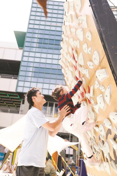 小朋友在上生·新所“轻轻松松喜剧节”体验攀岩。 本报记者 李茂君 摄