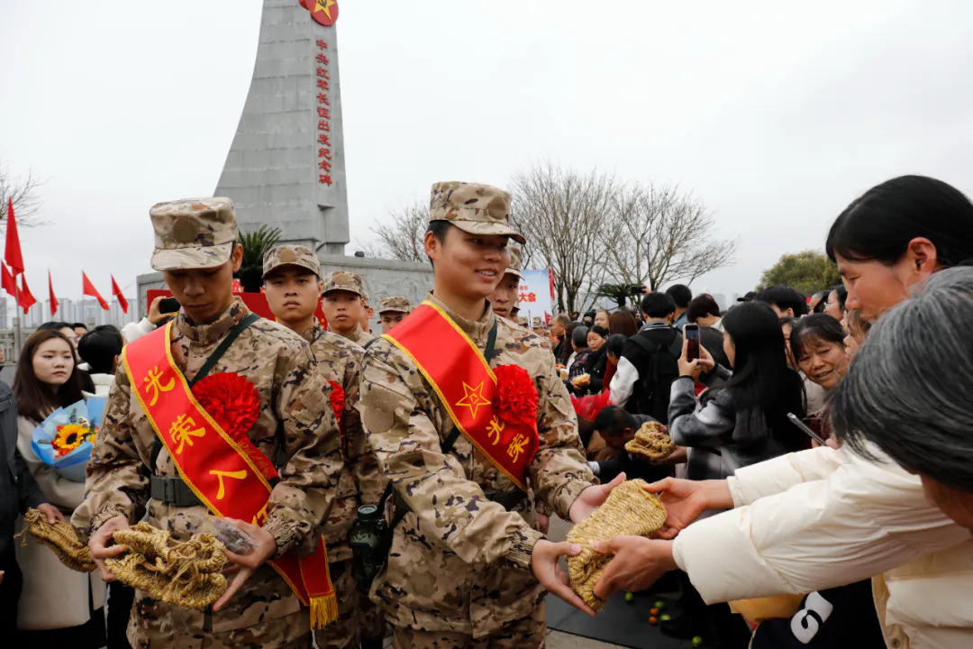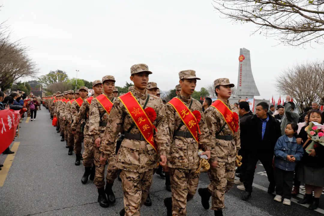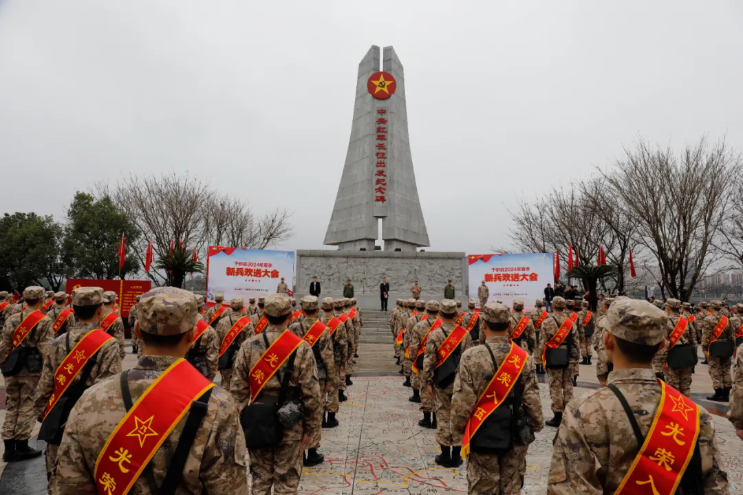 3月15日上午,于都县中央红军长征出发纪念碑前,红旗飘扬,鼓乐喧天,180余名新兵身披绶带,胸戴红花,整装待发。从长征出发地纪念园到渡江大道再到渡江大桥北桥头的道路两边,挤满了前来欢送的父老乡亲。
