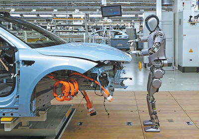 习近平总书记指出:“谁能把握大数据、人工智能等新经济发展机遇,谁就把准了时代脉搏。”《政府工作报告》提出,深化大数据、人工智能等研发应用,开展“人工智能+”行动,打造具有国际竞争力的数字产业集群。接入大模型的工业版人形机器人在新能源汽车总装车间进行实地“培训”。深圳市优必选科技股份有限公司供图
