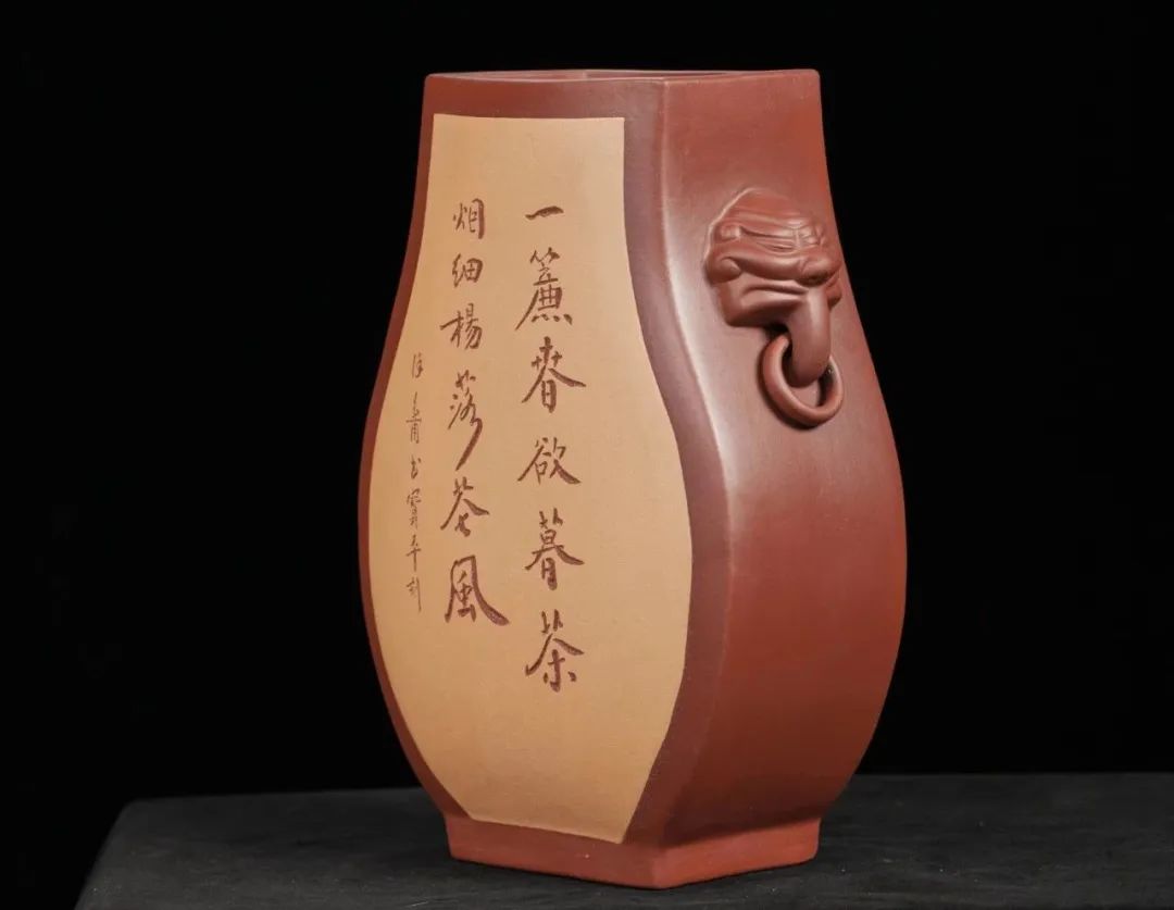 而这方《余音徐歇》砚,是一块江西婺源歙砚的宋代遗址中的残砚,砚石上还有古人制砚留下的凿痕,拿在手上有种与古人对话的感觉,弥足珍贵。此石外形不规则,非常难取成规则砚,宝平经过近一年左右的思考设计,采用现代理念思维,以不规则的外形设计,做到黄金比例的视觉效果,尽可能保留古人凿痕。砚背雕刻设计了一位古代文人教书的背影,背景采用透视层层递进的墙壁,解决了砚石斜薄的难题,从而达到景深视觉的效果。