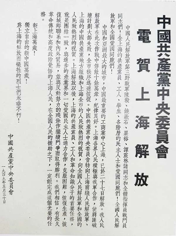 1949年5月30日,中国共产党中央委员会电贺上海解放