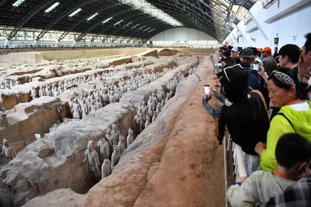 ▲5月17日,游客在秦兵马俑一号坑遗址参观。(新华社)
