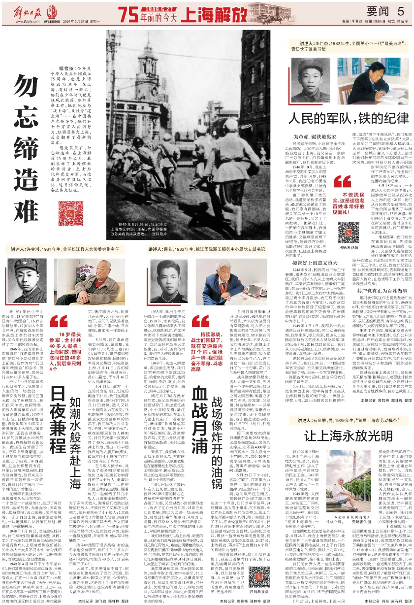 遗爱般般在,勿忘缔造难。在上海解放75周年之际,解放日报·上观新闻与上海市委老干部局合作推出“上海解放口述史”栏目,即日起陆续刊发多篇亲历者口述实录,与读者共同重温红色记忆,追寻信仰足迹,奋进伟大征程。