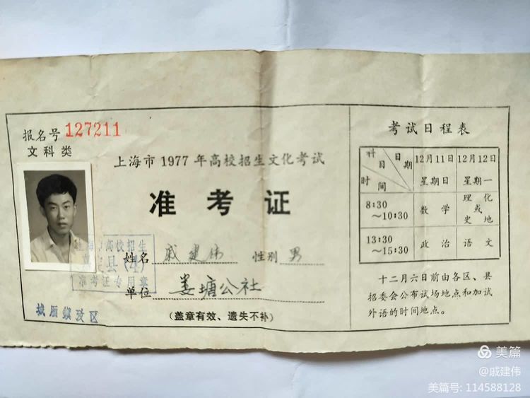 几天之后,通过文化初考的我接到通知,去生产大队填写报名登记表,大队盖章后,再去公社正式填写高考报名登记表及志愿,并交报名费5角,照片二张。距离高考前三天,我终于拿到了弥足珍贵的“上海市1977年高校招生文化考试准考证”。