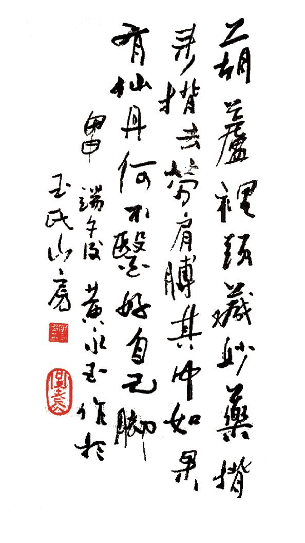 2003年玉氏山房落成,先生回到凤凰过年。先生兴致高,写了若干春联。大门写了一副应景联:“凤凰山水甲天下,五筸男人名堂多”。厨房门联:“所谓佳肴美味,其实百姓家常”。整个院子一派喜气,祥和又艺术。