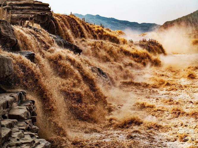 黄河在这里由宽而窄,由高到低,只见那平坦如席的大水像是被一个无形的大洞吸着,顿然拢成一束,向龙槽里隆隆冲去,先跌在石上,翻个身再跌下去,三跌、四跌,一川大水硬是这样被跌的粉碎,碎成点,碎成雾。(参见《壶口瀑布》文)