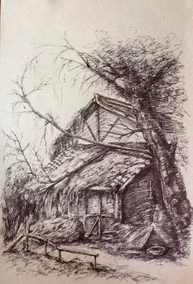 我漫步在田野,在一片没有油菜花的荒芜里看见一处无人居住的茅屋,很破败。我画下了它,它却很美。
