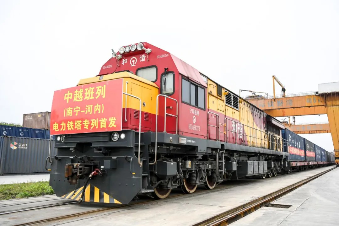 ▲3月8日上午,一列满载340吨电力铁塔的中越班列从广西南宁国际铁路港开出,发往越南河内。这是广西首次开行电力铁塔专列。(新华社)
