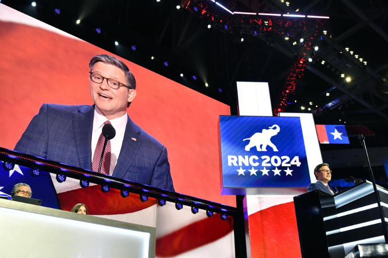 7月15日,在美国密尔沃基举行的共和党全国代表大会上,美国国会众议院共和党籍议长迈克·约翰逊正式宣布提名特朗普和万斯为共和党总统和副总统候选人。新华社记者李睿摄
