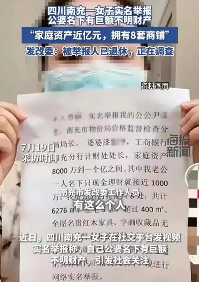 近日,四川南充一女子在社交平台发视频实名举报称,她的公公婆婆名下有巨额不明财产。该女子称,她的公公是南充市物价局价格监督检查分局局长,婆婆是工商银行南充分行计财处处长,两人名下资产近亿元,其中包含有8套商铺,3套住宅,以及大量红木家具和收藏的字画,超体制内正常收入水平。