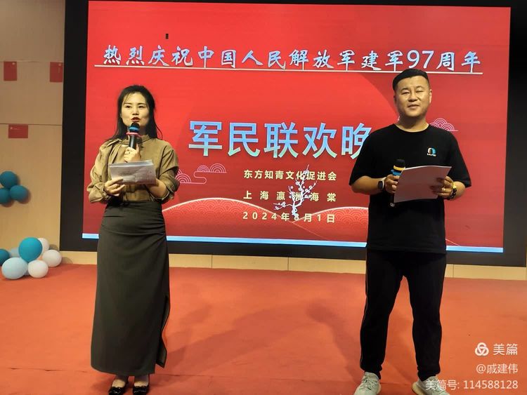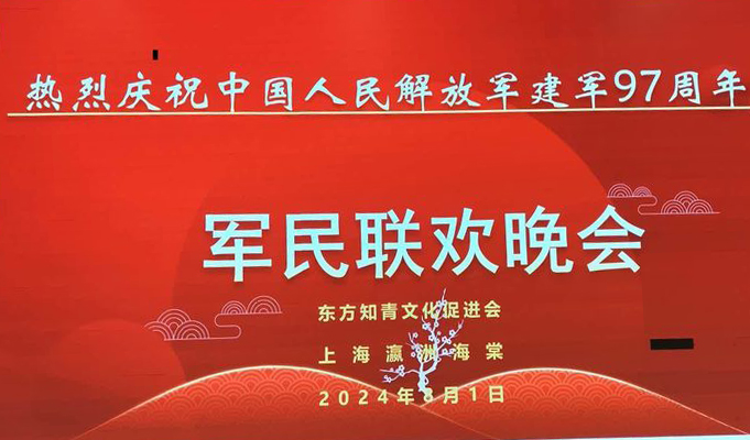 当天晚上,东方知青艺术团队的部分演职人员顾不上休息,与崇明当地的艺术团队联袂举行了一台“庆祝建军97周年军民联欢晚会”。熬过了白天的酷热,夜晚的崇明岛不时有凉风习习拂过,玉海棠餐饮大厅灯火璀璨,济济一堂的部队首长、退伍军人及各界人士嘉宾,不时被台上精彩的演出所吸引,激起阵阵掌声、喝彩声。同台庆祝建军节,抒发着对人民解放军的热爱,抒发着东方知青对崇明新农村建设所带来的巨大变化的深深祝福,抒发着东方知青与崇明父老乡亲的深厚情谊。