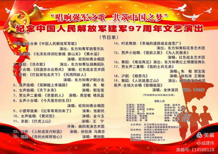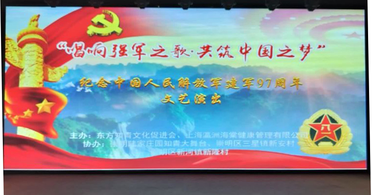 为了纪念中国人民解放军的丰功伟绩,进一步响应毛泽东同志提出“向解放军学习”的伟大号召,努力贯彻习近平总书记的强军思想,8月1日建军节这一天,东方知青各支艺术团的队员们在张国弟会长的带领下,冒着酷暑、顶着炎炎烈日奔赴崇明岛,为当地的农民兄弟、父老乡亲送上庆祝建军节的文艺演出。