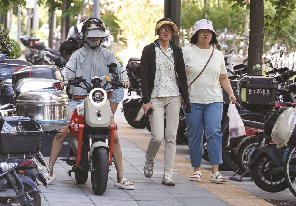 热浪滚滚,市民“全副武装”出行。 本报记者 袁婧摄