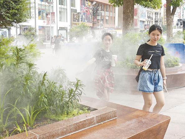 南京路步行街世纪广场开启喷雾降温 本报记者 刘歆 摄