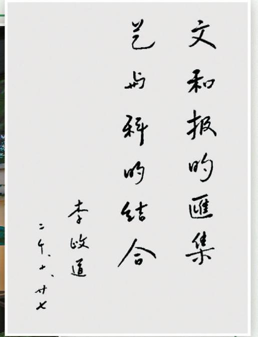 李政道曾为本报“科技文摘”专刊题词:文和报的汇集,艺与科的结合。 (资料照片)