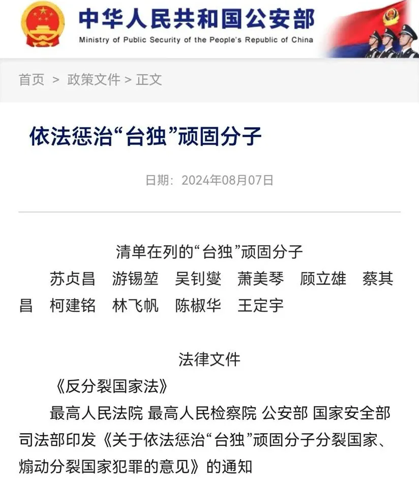实际观察大陆公安部网站,确实在政策文件列表中,新增“依法惩治‘台独’顽固分子”栏目,发布时间为2024年8月7日。点入后,里面包含“清单在列的‘台独’顽固分子”和“法律文件”两个版块。