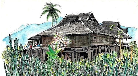 那天岩香是把我直接带到他女朋友家里的,他说自己家寨子还在前面更远的地方。还没到楼前,岩香已经大声地呼唤了。一群傣族姑娘应声从楼内来到晒台上,均身穿素白紧身衣,下着水红水绿五彩缤纷筒裙,花枝招展。姑娘们唧唧喳喳地和岩香说着什么,岩香满脸笑容,大声回答着。