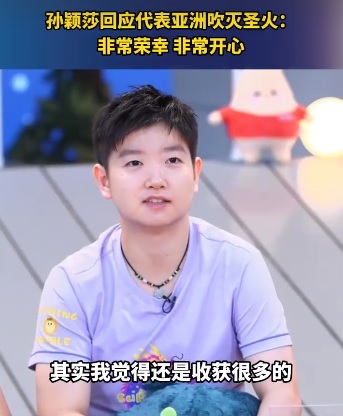 孙颖莎谈到在巴黎奥运会闭幕式上吹灭圣火,她说:在法国待了整整一个月,奥运之旅收获很多,有好的不好的回忆,都是人生中珍贵的回忆。最后参加闭幕式还是非常荣幸,邱指导陪自己多待了一天。现场氛围真的非常热情,最后一刻代表亚洲参加闭幕式。最后吹灭了圣火,还是非常荣幸非常珍惜。