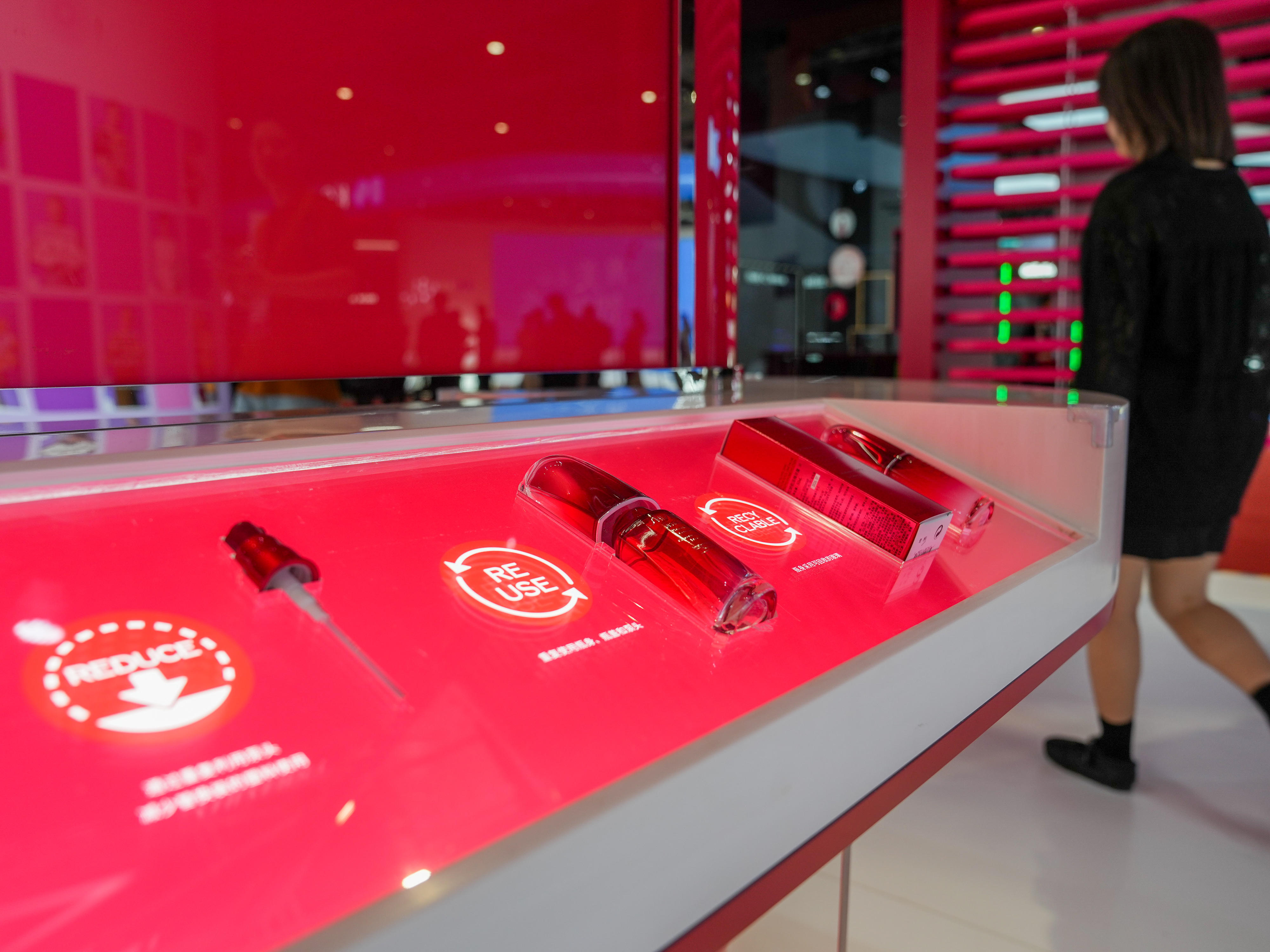 2023年11月5日在第六届进博会消费品展区资生堂展台拍摄的红腰子空瓶。(新华社)