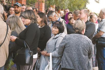 8月13日,在俄罗斯库尔斯克市,居民排队领取救援物资。 新华社发