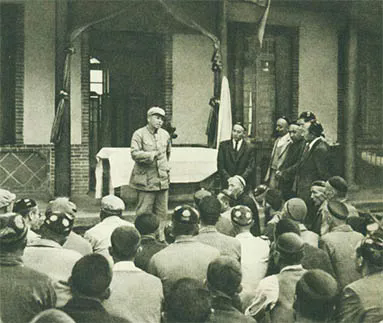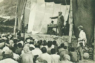 ◆1948年7月,彭德怀在西北野战军司令部、政治部直属单位于黄龙山召开纪念“七七”抗战十一周年大会上讲话。