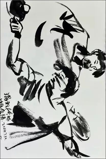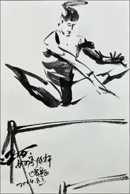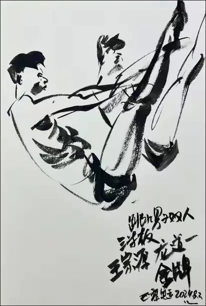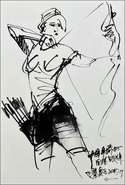 提到这次的奥运速写之旅,得追溯到上个世纪80年代,那可真是风雨兼程,历尽磨难。经过多年的磨练,我在大型体育赛事的速写中简直是如鱼得水,游刃有余。几十年来,我观摩了奥运会、世界杯、欧洲杯等大场面,早已对运动员那肌肉线条的力量与韵味驾轻就熟。每当中国队夺金时,我就像是兴奋的猎手,迫不及待地开始创作。每一幅速写作品,时间不超过10分钟,速度快得就像闪电侠,眼花缭乱。在创作人体动态速写时,我总是脑海中预先构思出那个最具表现力的瞬间,敏锐的洞察力和瞬间捕捉的本领是必不可少的,力求打破那种静止的僵硬感。因此,每次动笔之前,我都得在脑海里彩排那个最有戏的瞬间。