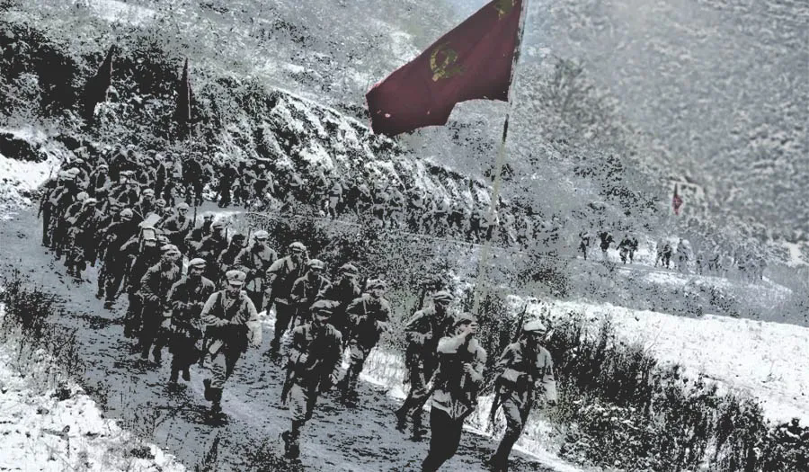 二是德式钢盔的可能性无法排除但肯定不是M35钢盔。艺术家采用德式钢盔有优化视觉效果方面的考虑,但不能认定为错误,因为无法完全排除可能性。国民政府与德国的军事合作始于1927年“四一二”政变后,蒋介石于是年11月正式会见了曾当过德国名将鲁登道夫高级助手的马克斯·鲍尔上校。蒋介石欣赏鲍尔的才华,为掩人耳目,授予其“经济事务顾问”的头衔。鲍尔接受委任并回国挑选了46名退役军官,组成一个精干的援华军事顾问团(后在历任团长的努力下阵容扩充至120人)。在鲍尔的居中联络下,哈布罗(亦称合步楼)、西门子、克虏伯、法本等德国著名军火公司纷纷与国民政府签订军火贸易合同。因此,从中德开始军事合作到中央红军踏上长征路之前,不排除包括钢盔在内的德制军械进入国民党军队并用于对苏区作战,同样亦无法排除德式钢盔被红军缴获。但红军能缴获到的钢盔绝不可能是二战中大名鼎鼎的M35钢盔,因为M35钢盔于1935年7月定型,而同年10月中共中央和红一方面军完成长征,所以即便红军在长征前缴获德式钢盔,也只可能是与M35外观类似的M16、M17、M18等早期型号。