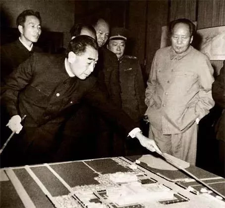 ◆1958年底,毛泽东、周恩来等在审查天安门广场和人民大会堂的建筑设计方案。