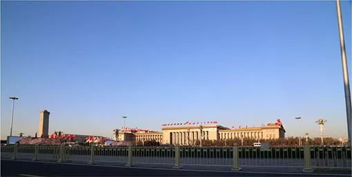 ◆蓝天下的天安门广场,朝阳照耀下的人民大会堂,庄严而肃穆。