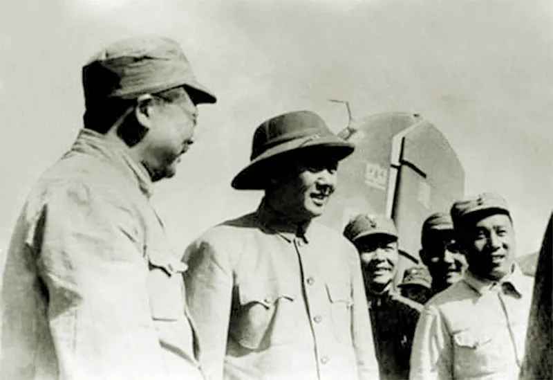 ◆1945年8月,李克农在延安机场为毛泽东(左二)赴重庆谈判送行,左一为李克农。
