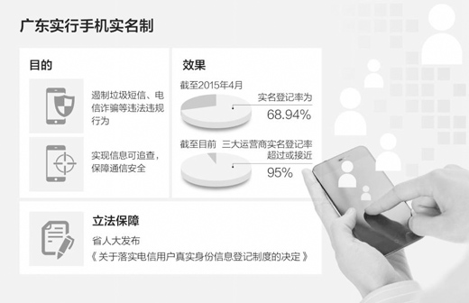 广东省通信管理局局长古伟中介绍,自国家推行电信用户真实身份信息登记制度以来,广东严格落实了新入网用户一律实名登记的制度。截至2015年4月底,广东全省电信用户实名登记率为68.94%,共登记了1.4亿名新老用户。但由于缺乏有力的法律手段,广东仍有6319万在网老用户未实现实名登记。