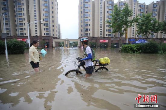 7月4日,南京城东南银龙雅苑一带,市民在被水淹没的道路上前行。连日的降雨使南京多河水位暴涨引发内涝。江苏省防汛防旱指挥中心当日通报,长江下游汛情致江苏14.1万人受灾,直接经济损失约9.352亿元,水利工程直接经济损失约3350万元。中新社记者 泱波 摄