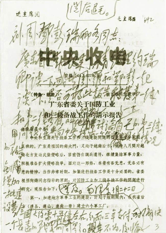 ◆毛泽东对《广东省委关于国防工业和三线备战工作的请示报告》电报作出的批示。