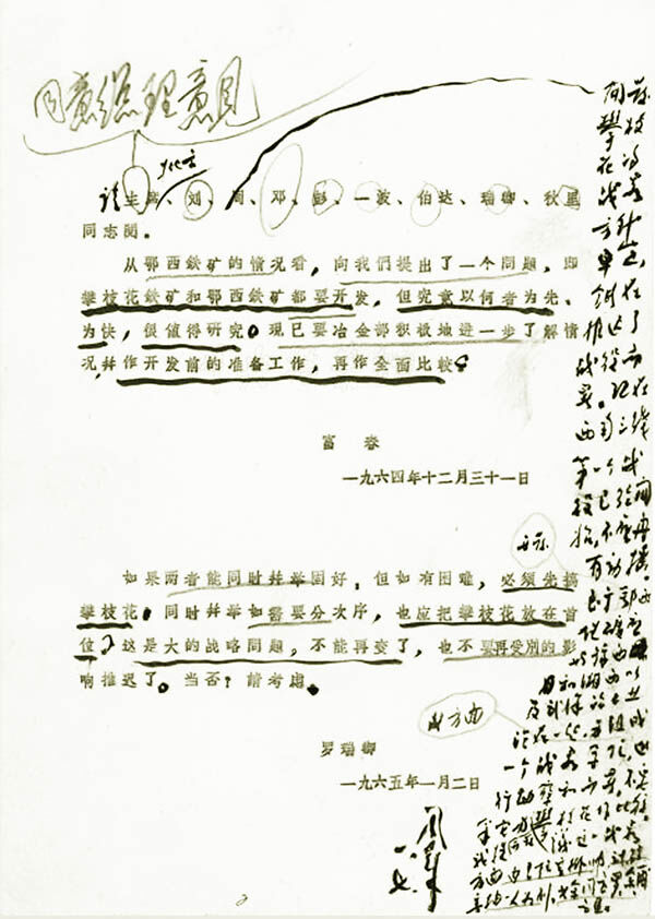 ◆毛泽东、周恩来对李富春、罗瑞卿关于开发攀枝花铁矿和鄂西铁矿的意见批示。