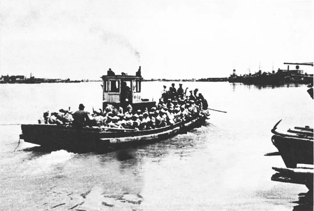 ◆人民解放军自浦东渡过黄浦江准备进入上海市区。