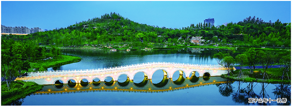 站在观景平台上,山脚下的中心湖、十一孔桥和远处的卢浦大桥尽收眼底。而十一孔桥与双子山山峰起伏呼应,形成“桥上赏园、园中赏桥”的景观。