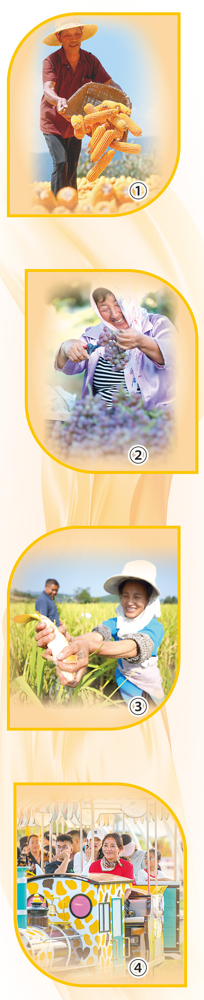 图①:湖北省宜昌市秭归县九畹溪镇穿心店村,村民在翻晒收获的玉米。王 罡摄(人民视觉) 图②:山东省平度市大泽山镇洼子高家村,农民在分拣葡萄。梁孝鹏摄(人民视觉) 图③:贵州省丹寨县龙泉镇卡拉村,村民在抓稻田鱼。杨武魁摄(人民视觉) 图④:江苏省宿迁市宿城区蔡集镇牛角村,游客在体验小火车。徐江海摄(人民视觉) |