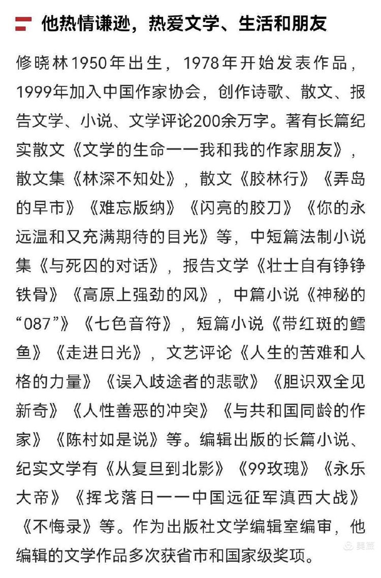 在此,沉痛悼念修晓林先生。他的离去,让我们深感人生的无常和短暂。愿他在另一个世界能够继续他的创作之路,用文字温暖更多的人心。我们将永远怀念他,永远记住他为文学界做出的贡献。