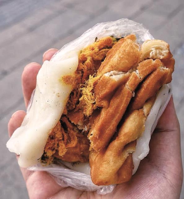 年糕团的头牌则是虹口糕团厂。很多上海的阿姨爷叔们会在早上买一份奶香糕团包油条作为早饭,有甜有咸。最好卖的是“全家福”,榨菜、咸菜、肉丝、芝麻糖每样放一点,油条会放到烤箱里去烤一会儿,吃到嘴里还是酥脆的。据说最正宗的年糕团是大米发出来的,而不是糯米,而且咸菜都是现炒、现包、现卖的。把糕团压扁放上芝麻等磨的粉,加入现场炒熟的咸菜豆干,最后放入油条包好,口感又糯又香。