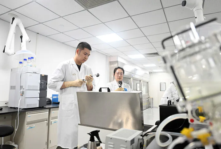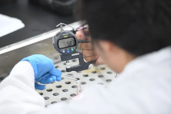 9月9日,在赛诺医疗科学技术股份有限公司天津研发实验室,工作人员对一款药物涂层洗脱支架进行测量。新华社记者 赵子硕 摄