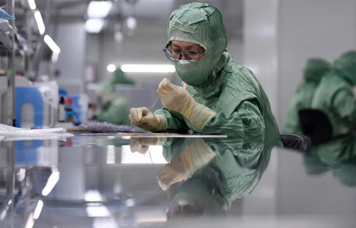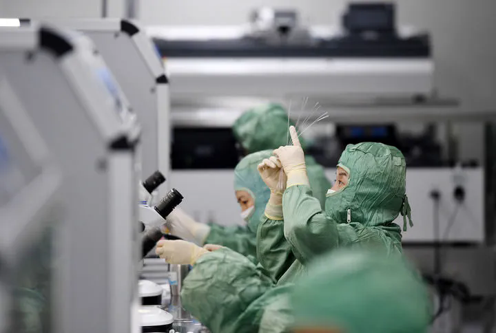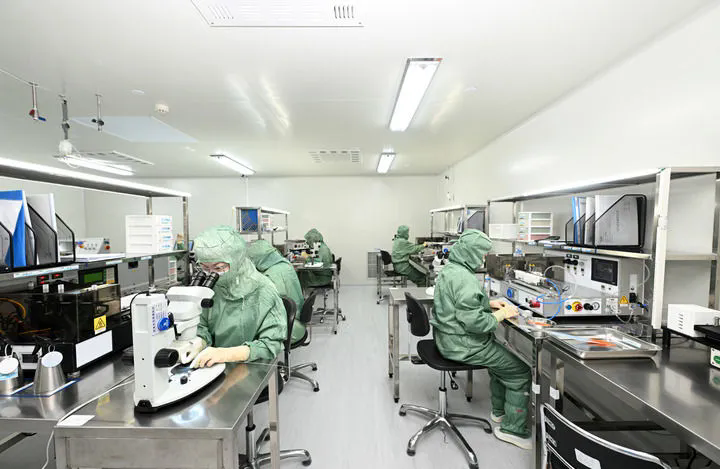 9月9日,在赛诺医疗科学技术股份有限公司天津生产基地,工作人员在导管制备室车间内对组装后的支架导管进行检测。新华社记者 赵子硕 摄